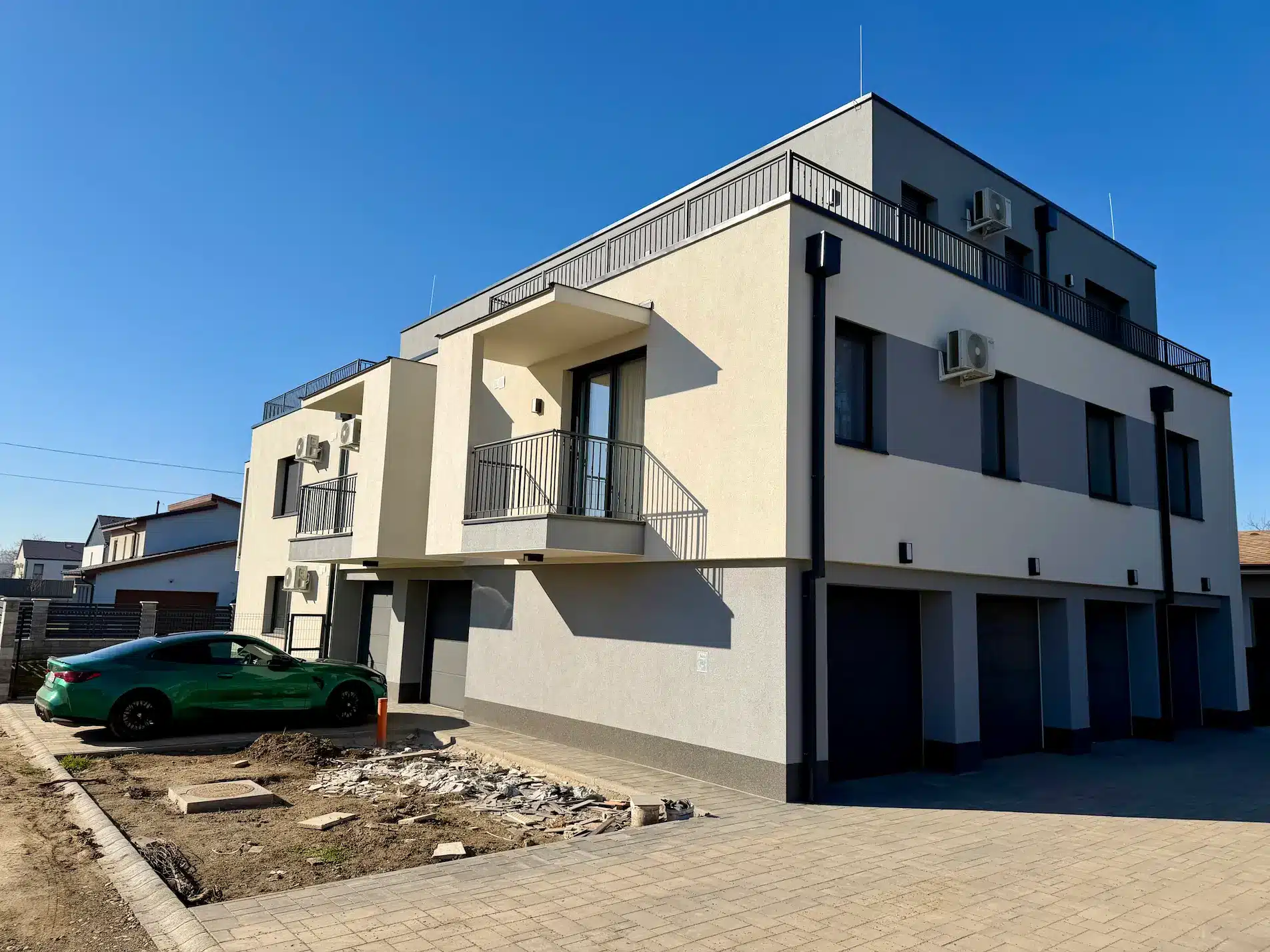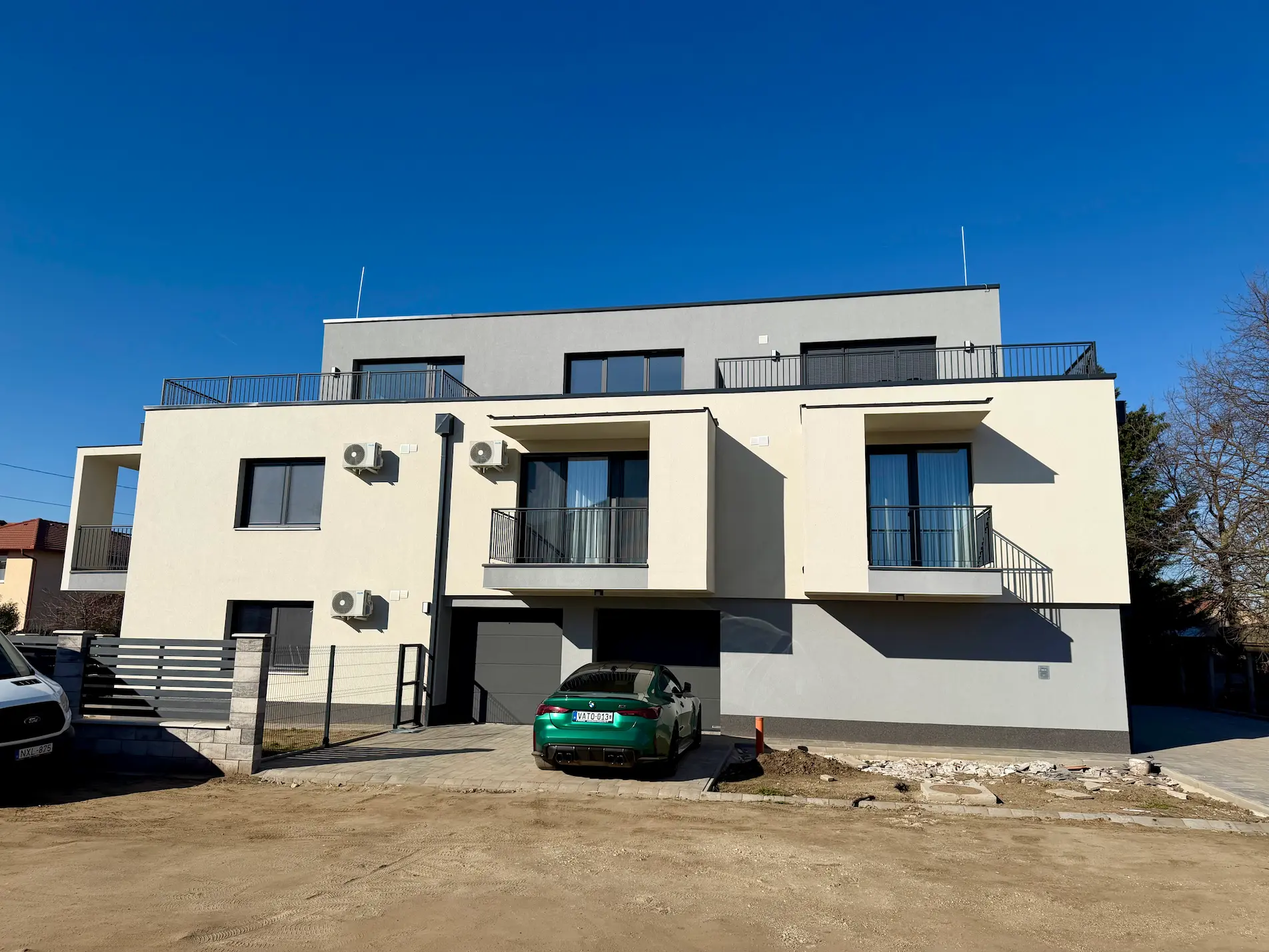 A társasház beton alapra épült, 30 centis wienerberger porotherm teherhordó-, és 10 centis válaszfalakkal, minőségi 10 centis külső hőszigeteléssel, és 3 rétegű 7 légkamrás műanyag antracit nyílászárókkal.